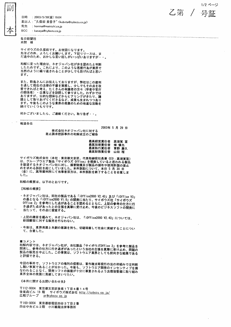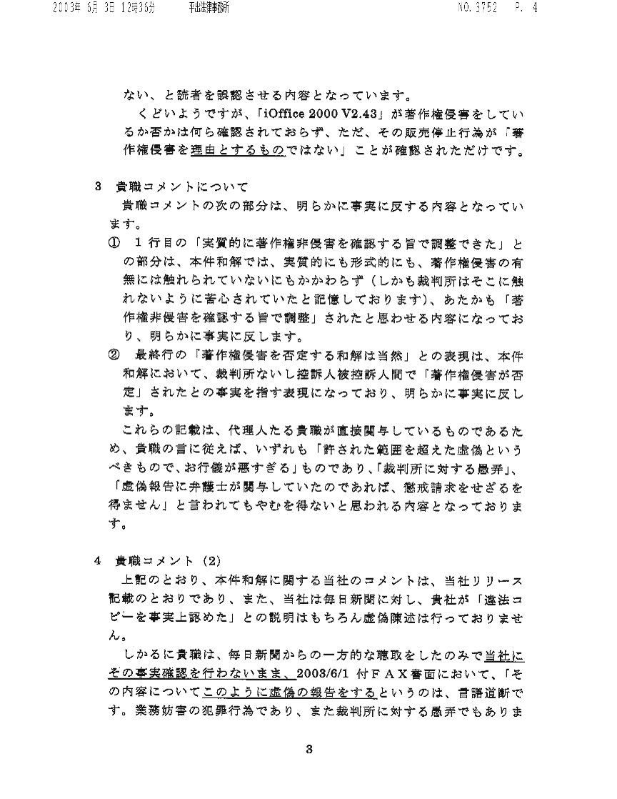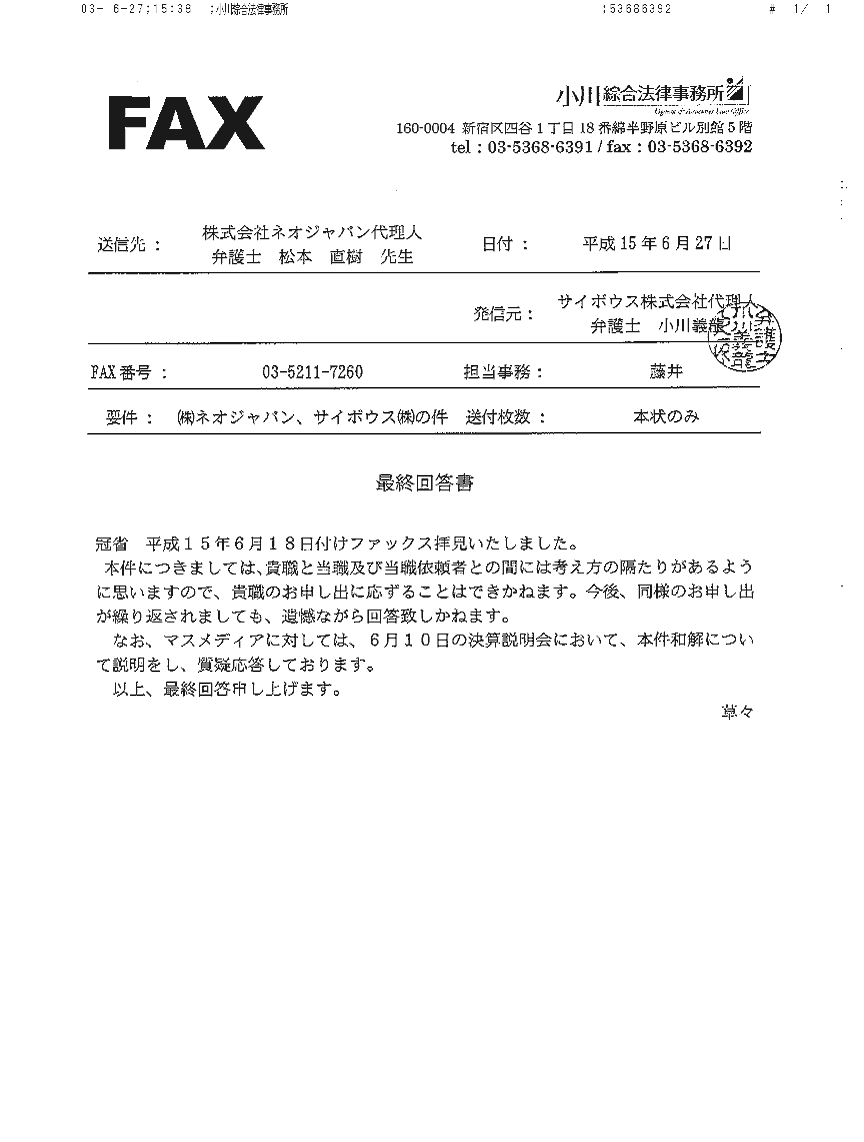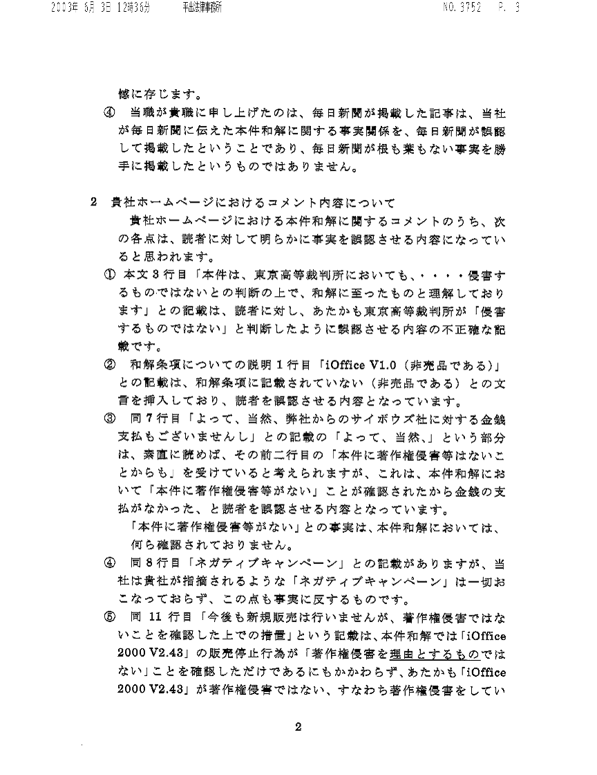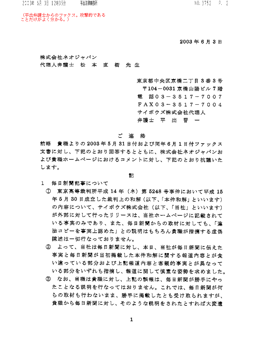 5.1 サイボウズのその後の説明上記のように両者の言い分がまったく対立していたので、ネオジャパンの関係ページでは、両方を並記していた(下記の経過で修正し、現在では並記ではなく毎日新聞の説明のみを残してある。)。 その後6月17日に、毎日新聞から電話を受けた。その話によると、サイボウズ社から毎日新聞への説明では、 ・サイボウズがミスリーディングな説明をしたことを認める、とのことだという。だから、上記のように並記しているのは不適切だから直してくれ、という趣旨の電話だったのである。これを受けて、サイボウズの主張を並記していたのを削除し、毎日新聞の説明のみを残した。 5.2 サイボウズの説明の矛盾この毎日新聞経由で聞いたサイボウズの説明は、2つの点で極めて奇妙なものと思われた。 第1は、誤報の原因となった、和解の説明がおかしかったことを今度は自ら認めていると思われたことである。「違法コピーを事実上認めた」など、実際の和解内容とはおよそ違っており、仮にそうした説明をしたというのなら、それはウソを付いていたことになるはずだと思われた。 第2は、「毎日新聞が勝手にやったこと」等と言っていたことについてである。この毎日新聞経由の話では、前言を撤回したかのようだった。もっとも、この前言は、6月2日の時点では、発言者個人(平出弁護士)はウソの積もりではなかったのかも知れない。その時点では、会社側からその様に説明をされていた可能性があると思う。しかし、組織全体を観察対象とするなら、自らの発言内容についての虚偽説明であると理解された。さらに、6月3日付けの平出弁護士のファクスについては、調査した上での会社としての主張であるが、事実に反しているように思われる。 5.3 サイボウズの主張の疑問なお、“その旨を弁護士を通じてネオジャパンにも伝えた”と言っている、という話については、若干の説明がいる。実は、6月3日付けの平出弁護士のファクスを受け取った直後、平出弁護士から電話を受けた。この電話では、ファクスは「会社の方針」として、口頭では常識的な話がなされた。“違法コピーを認めた”が間違いなのは確かで、それはハッキリさせるから、それ以上に紛争を拡大させたくない、などの話であった。その話の中では、サイボウズの人間がミスリードしたのだろうということも半ば認めてはいた。 しかし、これは“その旨を弁護士を通じてネオジャパンにも伝えた”というのとは異なる。6月3日付けの平出弁護士のファクスを撤回したわけではなく、むしろそれを「会社の方針」としていたのである(そのため、上記の6月17日の毎日新聞からの電話を受けるまで、ネオジャパンの経過説明のページでは、上記のように毎日新聞の説明とサイボウズの主張とを並記していた。毎日新聞の説明がおそらくは正しいのだろうとは思われたが(そして結果としてはそのとおりだった思われるのだが)、当方としては確実な根拠は持ち合わせておらず、サイボウズの「会社の方針」としては、6月3日付けの平出弁護士のファクスのとおりであるわけだから、その主張を無視したのではさらに抗議を受けることになると思われたためである。しかし結果から見れば、サイボウズの疑問な主張を垂れ流すことになっていたものであり、毎日新聞には改めて謝罪したい)。(6月30日追記: しかし、下に説明するように、サイボウズはその後も当方に対しては6月3日付けの平出弁護士のファクスを撤回せず、図々しくも「考え方の隔たりがある」などとするファクスを送ってきている。毎日新聞の言うところとは違うし、それどころか毎日新聞の言うサイボウズの説明ともまったく違う) どうやらサイボウズは、ミスリードしたのは事実なので、毎日新聞に対してはそれを認めざるを得ないが、当方に正式にそれを認めたり(ましてや)謝罪したりするのはイヤだ、ということとしか理解できなかった。 5.4 その後の経過当方では、6月3日のファクスに対して、上記のような電話での話があったので、文書での回答を控えていたのだが(あの攻撃的なファクスに回答したのでは、紛争がエスカレートしてしまうのが必至だから)、上記のような経過であり、また、違法コピーを認めたものでないことをハッキリさせるという話が一向に実行されないので、当職(松本)から平出弁護士宛の2003年6月18日付けのファクスを出した。 しかし、現在(6月27日早朝)まで、これに対して何の反応も受け取っていない。 また、2003年6月25日には、平出弁護士に本書面のドラフトをファクスしたが、これに対しても(6月27日早朝まで)何の反応も受け取っていない。 5.5 掲載後の経過(2003年6月29日に加筆)本文書のウェブページへの掲載(6月27日早朝)の後、平出弁護士から、Fri, 27 Jun 2003 15:27:15 +0900のメールで、次のような連絡があった: 松本直樹 先生 FAX拝見しました。サイボウズの回答は、小川弁護士からFAXが入ると思わ れます。 なお、ホームページに掲載内容につい