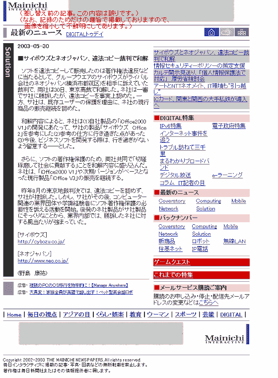 こうした和解が成立した2003年5月30日(金曜日)の夜、毎日新聞の報道があった(ウェブページへの掲載)。これはとんでもない誤報で、「違法コピーを事実上認めた」等としていた。その縮小イメージ。 ネオジャパンの方でこれに気付き、金曜日の夜には私も連絡を受けた。土曜日の昼間に、毎日新聞の担当記者からコールバックを受け、当方から和解内容について説明し、記事が誤りであることの理解を得た。その後間もなく、掲載記事は差し替えられた。差し替え後のページ(そのアーカイブ)へのリンク。 なお、誤報の内容説明や他の関係頁へのリンクについては、ネオジャパンの関係ページを参照していただきたい。 |